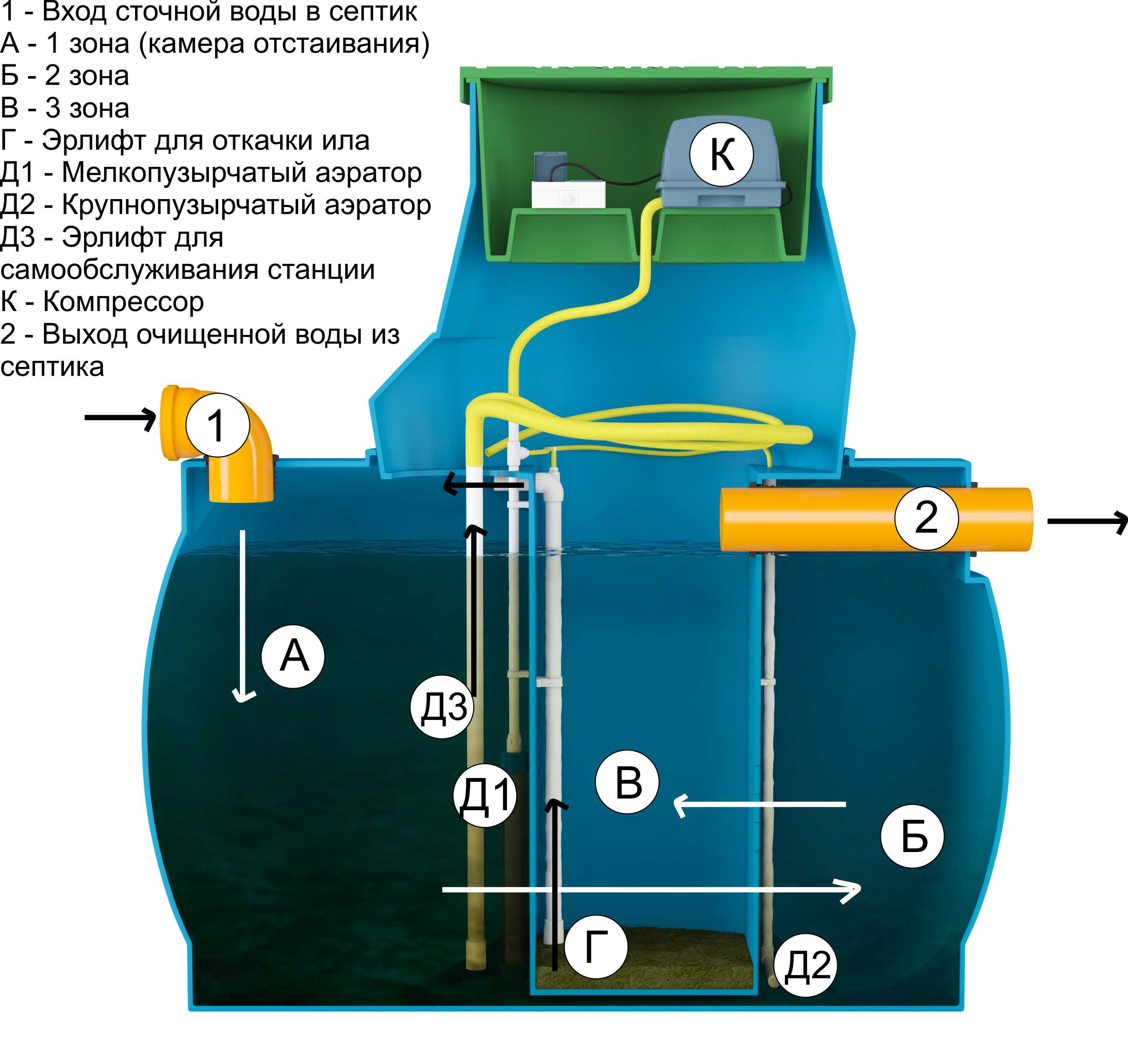 Принцип действия СЕПТИКА ДОЧИСТА очистительного типа основан на использовании механических процессов отстаивания и биоочистке: Сточная вода из жилого дома по канализационным трубам самотеком поступает в первую зону (септическую часть грубого осадка), где задерживаются жиры, плавающие пленки, не осаждаемые частицы и поверхностно-активные вещества. Твердые вещества, попавшие со сточной водой и способные оседать, скапливаются на дне СЕПТИКА ДОЧИСТА в виде осадка (биомассы насыщенной микроорганизмами).