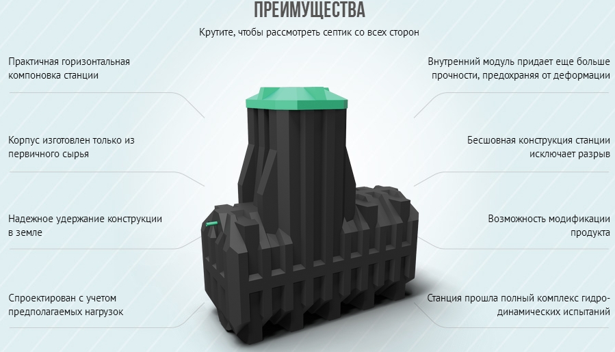 Абсолютно весь корпус септика выполнен по бесшовной технологии, что обеспечивает 100% герметичность конструкции. Уникальная форма септика с ярко выраженными ребрами жесткости, обеспечивает надежное удержание септика в грунте и недостижимую ранее прочность. Производство и сборка осуществляется в заводских условиях, на современном оборудовании. Линейка ТРАНСФОРМЕР PR - это септики с принудительным сбросом очищенных стоков, что означает подключение к сети 220 В.
