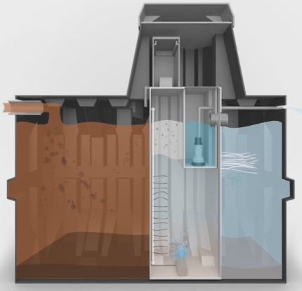 Технологический процесс очистки стоков выглядит следующим образом. Сточные воды через входной патрубок поступают в приемную камеру, в которой начинается процесс биохимической очистки под воздействием аэробных микроорганизмов, составляющих активный ил. Затем жидкость через фильтр крупных фракций переходит во вторую камеру – аэро-тэнк. Здесь происходит процесс мелкопузырчатой аэрации – насыщение жидкости кислородом для поддержания благоприятных условий для аэробных микроорганизмов.