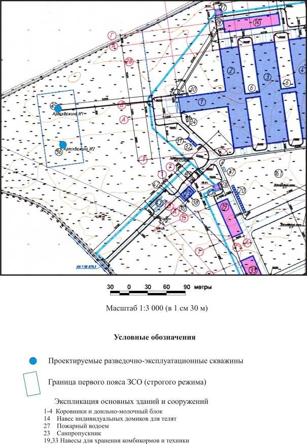 Бурение скважин предполагается для технологических нужд молочного комплекса «Васильково», где требуется вода питьевого качества. Потребность в подземной воде в целом по водозабору составляет 256,81 м3/сут. Разведочно-эксплуатационные скважины планируются глубиной ~ 80 м. Располагаются скважины на свободной от застройки территории в 200 м к западу от проектируемых коровников.