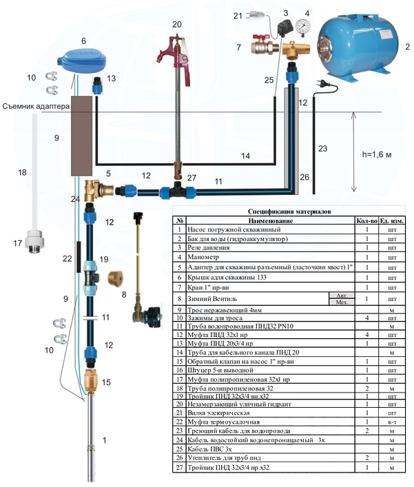 После спуска насоса в скважину, элементы адаптера соединяют, что позволяет использовать систему водоснабжения круглогодично.