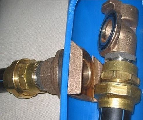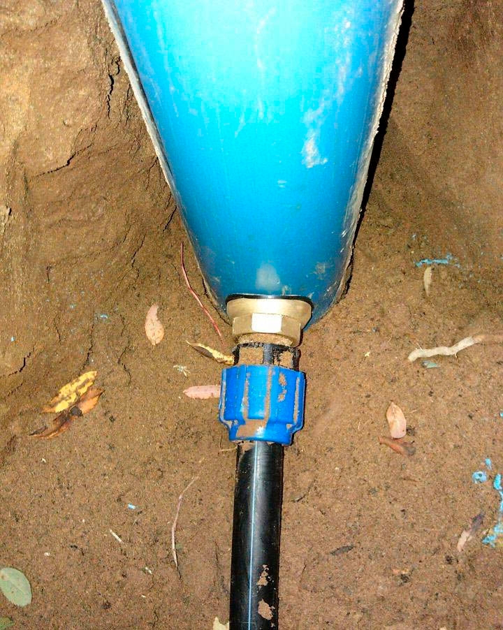 Скважинный адаптер врезается в обсадную трубу на глубине 1,5 - 1,8 метра и от него в дом по дну траншеи прокладывается водопроводная труба.
