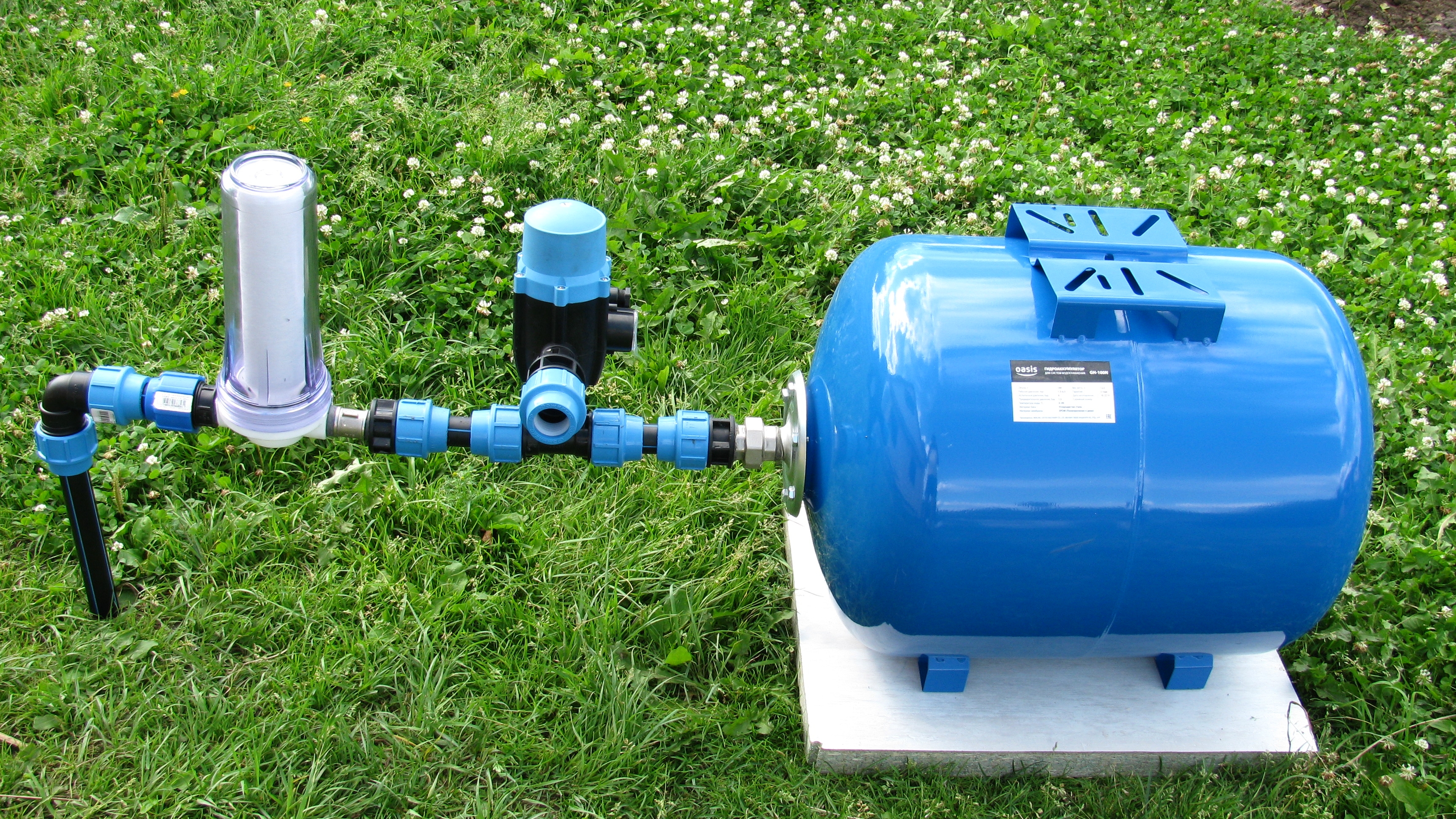 Если скважина имеет дебет более 150 литров в час, то внутри дома монтируется комплект насосного оборудования из мембранного бака 100 л., саморегулирующего греющего кабеля, фильтра 20", автоматического реле давления и защиты насоса от работы без воды. Мембранный бак 100 литров нужен для того, чтобы сократить количество включений насоса и продлить срок его службы.