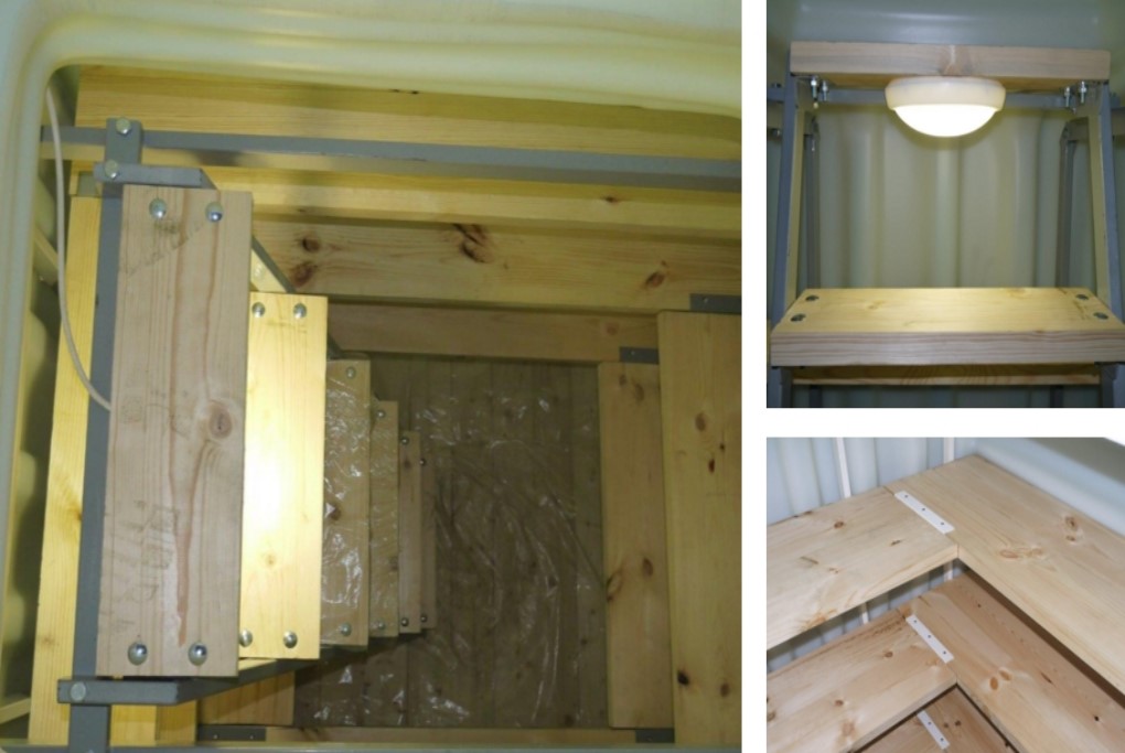 Готовый погреб представляет собой компактную цельную конструкцию в виде короба 1800 х 1700 х 2500 со встроенной приточной и вытяжной вентиляцией. Для придания повышенной прочности, стенки оснащены ребрами жесткости. В верхней части расположен вход, герметично закрываемый удобной прямоугольной крышкой. Внутри размещаются стеллажи с вместительными деревянными полками, прочная лестница, пол из деревянных досок, предусмотрено низковольтное безопасное освещение.