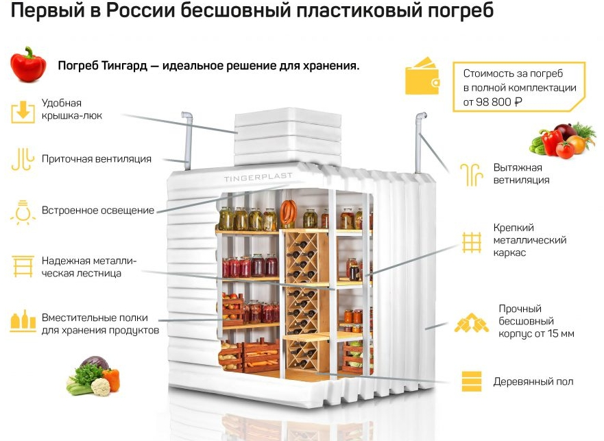 Оборудован деревянными полками, полом, приточной и вытяжной вентиляцией, освещением, лестницей и крышкой-люком. Вам не нужно беспокоится о дополнительном оборудовании. Не подвержен гниению, коррозии, не повреждается грызунами.